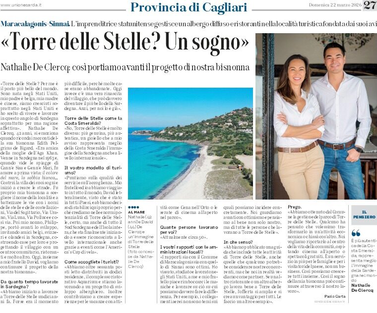 Torre delle Stelle non è solo una destinazione, ma una visione. Una visione che oggi trova spazio anche sulla stampa, grazie all’articolo pubblicato su L’Unione Sarda, che racconta il percorso e il progetto guidato da Nathalie e David De Clercq.
